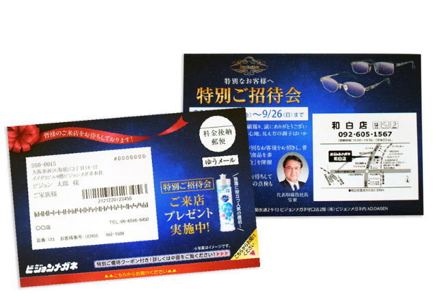 「変わったDM」という印象が強かったこちらのDMでは、店舗ごとに店長の写真を差し替え印刷するなど、イベントのイメージを再現できるようDMのデザインに関してもご提案。エンドユーザーに印象づけたいお得な情報やイメージを的確にクリエイティブ表現し、DMの企画から制作進行をスムーズに行います。