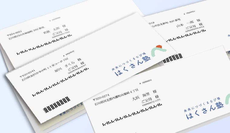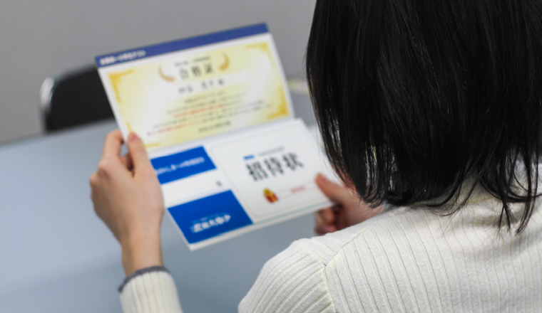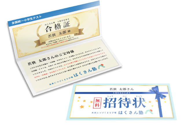 宛名に加え、合格証と招待状に入れる名前は可変印刷することで、納期の短縮を実現。テスト後10日程度でお客様に送付が可能になり、以前より早く結果を知らせることができるようになりました。
