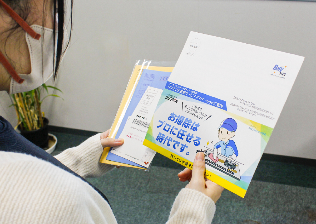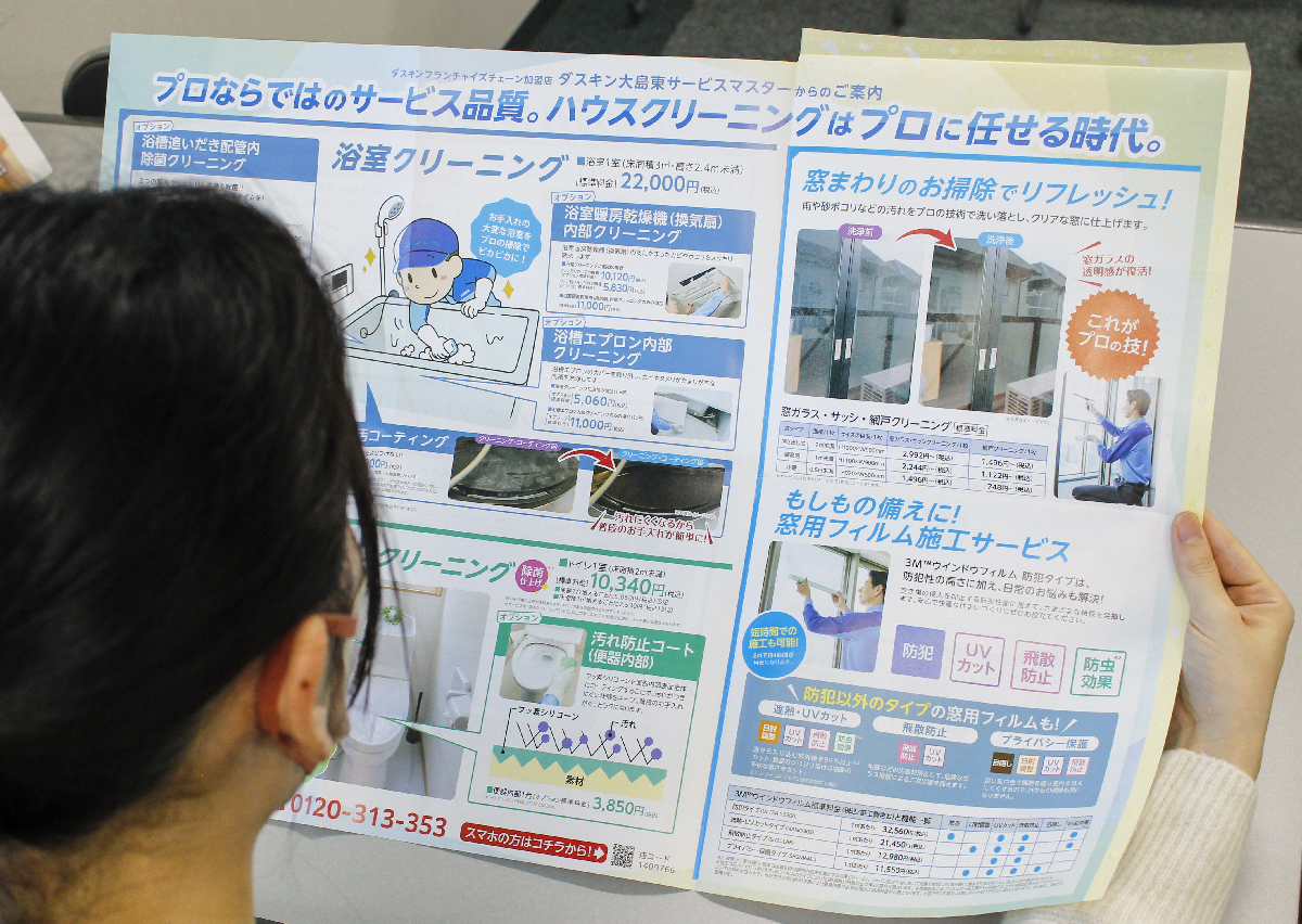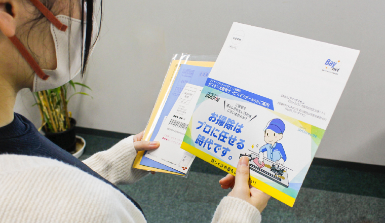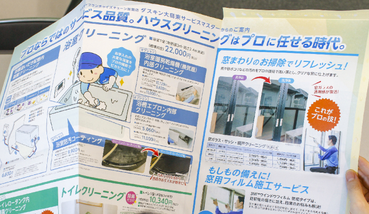 ハガキでは伝えきれなかったハウスクリーニングのプロの技術やビフォーアフターの効果を、開封後B2サイズの大判紙面で余すことなく表現。イラストや写真を大きく配置することで、サービスの価値を直感的に理解できるビジュアル訴求を実現しました。 広い紙面を活かした情報設計により、顧客の購買意欲を高め、問合せ数の増加に直結。 クリエイティブの質を妥協せず、むしろ訴求力を強化したことで、ブランド価値の向上とROI改善を同時達成しています。